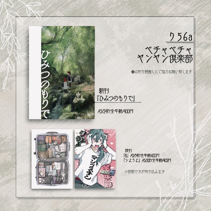 38 159 5/3 ブリデお品書きです! 新ユニオールキャラパロ本、り56aでお待ちしております。新刊詳細はツリーにて。 23/05/01 23:30