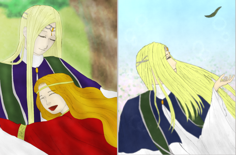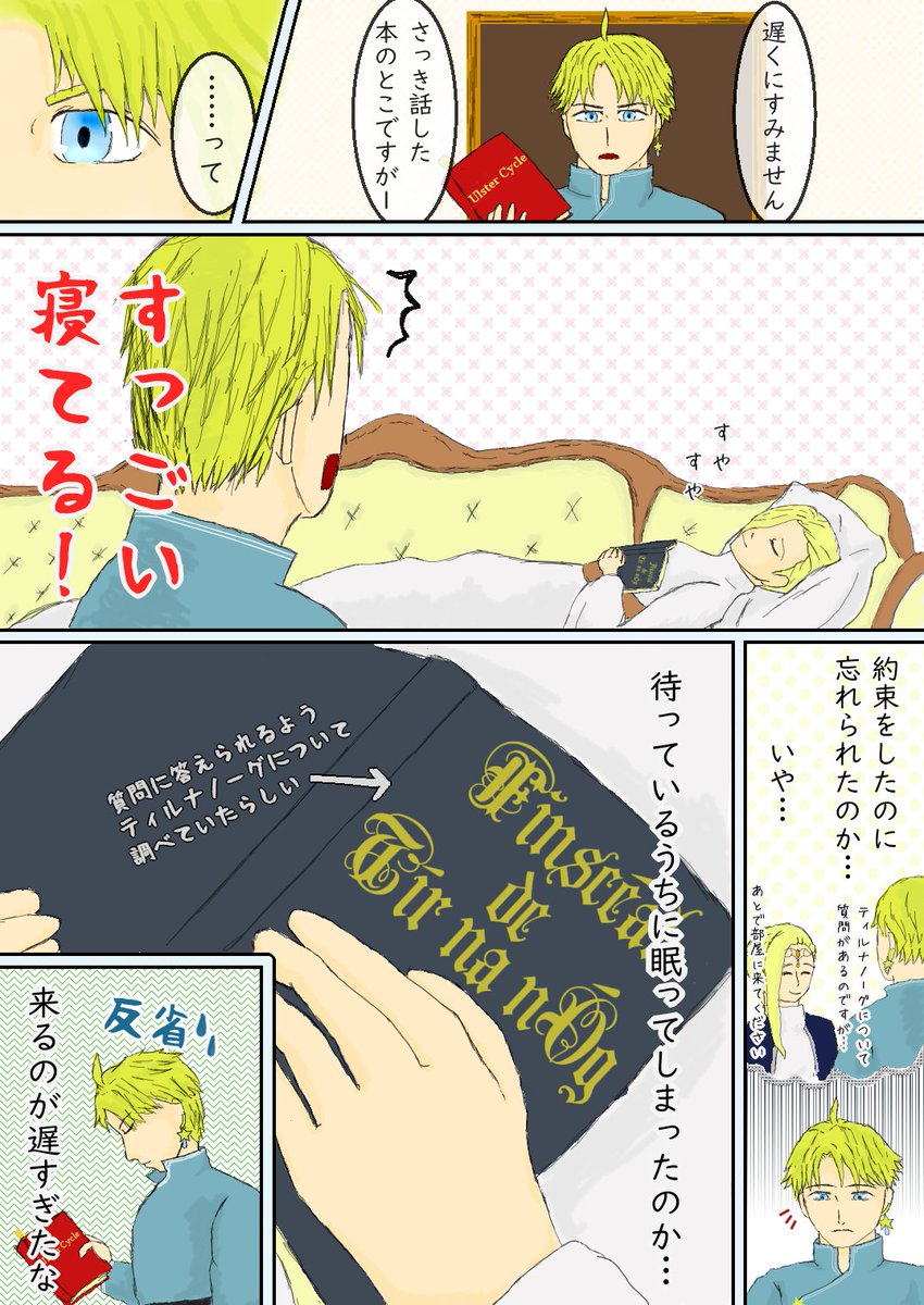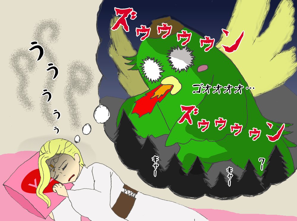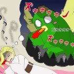 #今月描いた絵を晒す 実は音痴であることがみんなに知られてしまったミードさんとスイスイが伸びると知って悪夢にうなされるミードさん。枕の意味は分かっていない こうして並べると、スイスイが復讐に来たみたいに見える(ノ´∀`*)