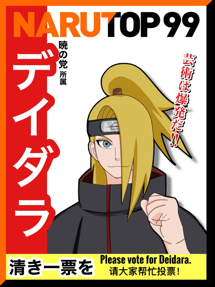良いですか、落ち着いて聞いてください 本日NARUTO人気投票の結果発表ですドキドキ🫀🔥 あとデイちゃん生誕祭まで残り22日! #NARUTOP99 #NARUTOP_ART #デイダラ誕生日CD2023
