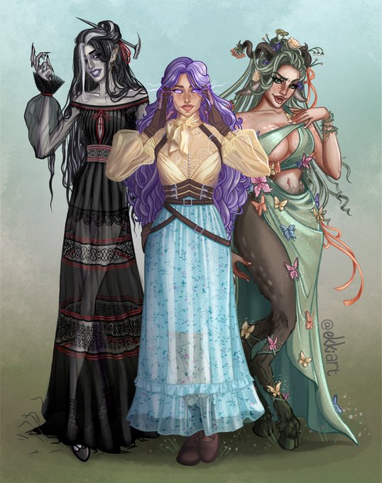 All Critical Role Campaign 3 ladies outfits done! . More in the thread below :) . #criticalrole #criticalrolefanart #criticalroleart #criticalrolecampaign3 #fearnecalloway #ImogenTemult #laudna #dndart #dndfanart #DnDcharacter #costumedesign #critter