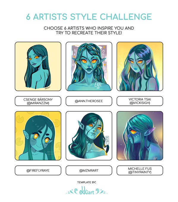 I don’t know if anyone has done this before but I haven’t seen it so here’s my 6 Artist’s Style Challenge, a take on the 6 fanarts challenge 😊 I included a blank template in the thread :) . . #sixfanarts #sixfanartschallenge #sixfanart #sixartists #sixartistsstylechallenge