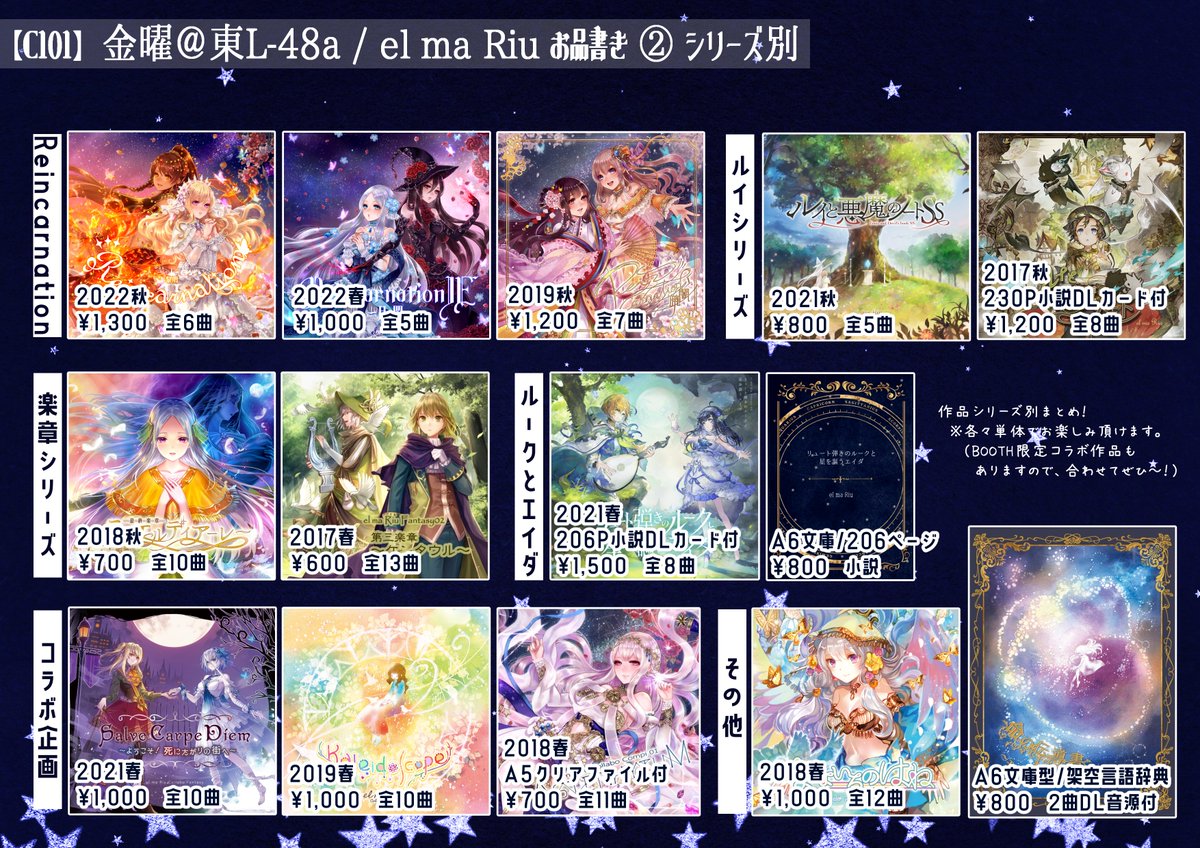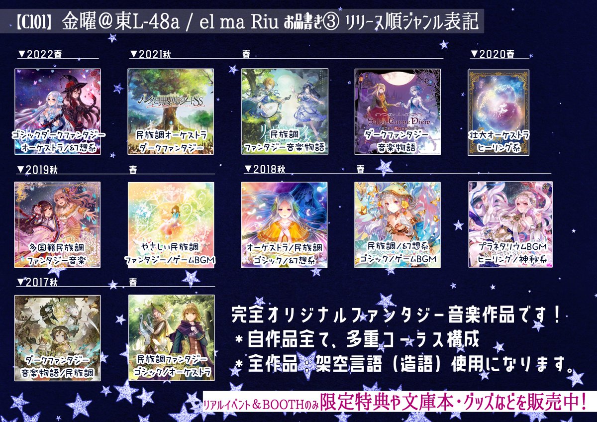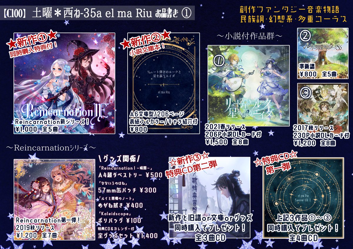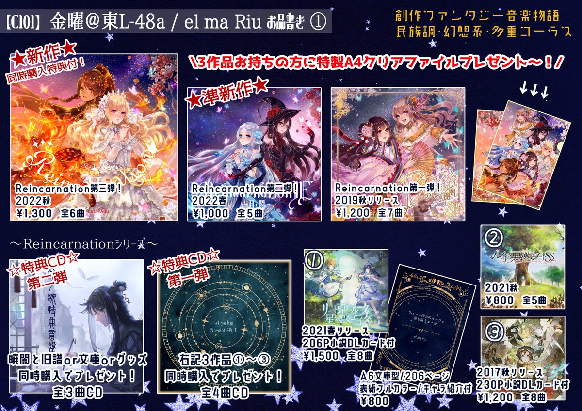 💐 #C101お品書き 💐 ✨12/30(金)東L-48a ✨創作ファンタジー音楽物語群です⸜(๑•᎑•๑)⸝ 同時購入特典CD2種類や、 クリアファイルプレゼント🎁もあります~!! 🎼 #C101WebCatalog 🎼 webcatalog-free.circle.ms/Circle/16813411 🎼試聴🎼 youtube.com/c/elmaRiu