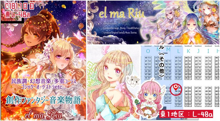 あなたのサークル「el ma Riu」は、コミックマーケット101で「金曜日東地区 "L " 48a」に配置されました!コミケWebカタログにてサークル情報ページ公開中です! webcatalog.circle.ms/Perma/Circle/1… #C101WebCatalog