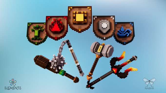 In Elements Game, explore the 5 biome 🗺️ each of them very atmospherically unique. Here are the shields & weapons available (if you unlock them 😉) @VoxEdit @TheSandboxGame #voxelart #voxel #NFT #TheSandbox #VoxelNFTs