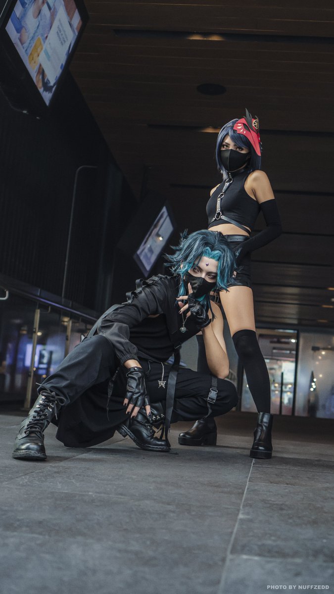 🟩⬛️𝐘𝐀𝐊𝐒𝐇𝐀+𝐓𝐄𝐍𝐆𝐔⬛️🟪 With my twin Mags (@/mgwolf_ on IG) as Kujou Sara 🖤 📸: NuffZedd #GenshinImpact #Cosplay #Xiao #KujouSara