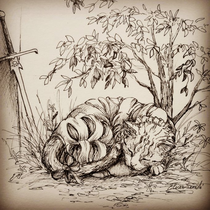 ✒️21st day of #Inktober! 😴 Today's theme is sleep ⚔️ After sparring ... even #hemacats need a nap! #hemanimals @inktober #inktober2020 #inktober2020day21 #CatsOfTwitter #cat #micio #historicalfencing #hema #historicalmartialarts #federschwert #ink