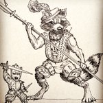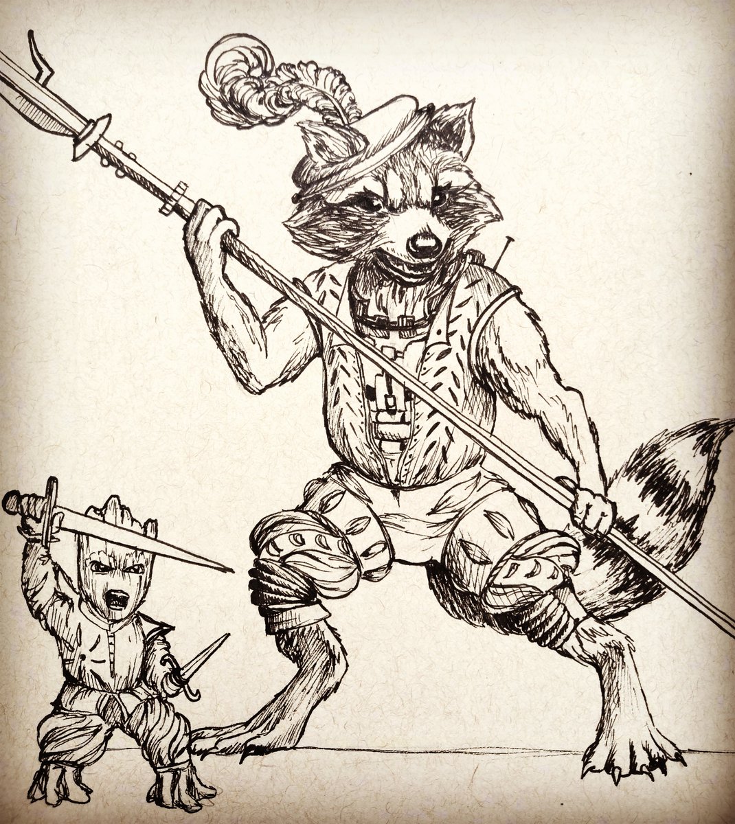#Inktober day 16 ✒️ Hey! #Rocket and #Groot ended up in a #space-time passage! They were catapulted into 1500, but luckily #Marozzo's giving them some advice ⚔️ #historicalmartialarts #guardiansofthegalaxy #hemanimals #nerdanimals @inktober #fanart #inktober2020 #inktoberrocket