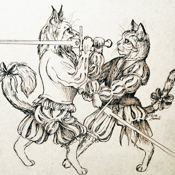 ✒️Nineteenth day of #inktober! Today's theme is #Dizzy 😳 Soon one of these two #cats will feel very dizzy! From the treatise of Paulus Hector Mair, of the sixteenth century #hemanimals #hemacat #inktober2020 #inktober2020day19 #historicalfencing #hema #CatsOfTwitter #catlover