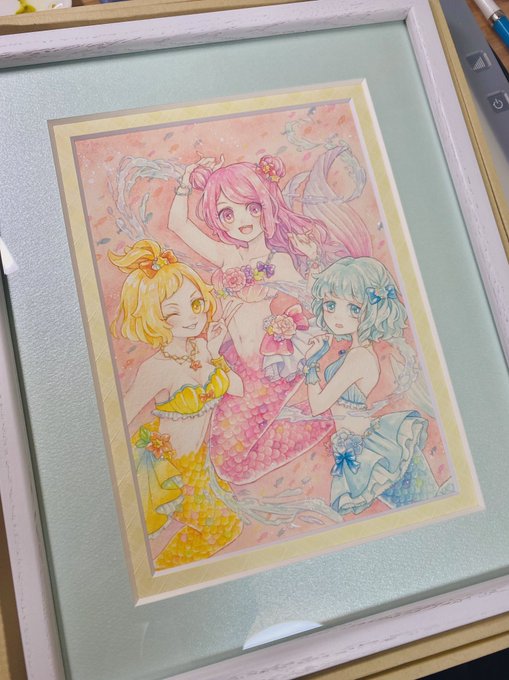 11 26 見てーーー!!初めての額装!! すごい!かわいい!!黄色のチェックとブルーのキラキラのダブルマットにしてもらいました✨ ARTs*LABoさんの人魚・妖精展2021に出品予定です🐠 #透明水彩 #ガチ制作会 21/07/18 21:01