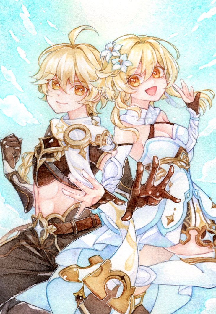 3 19 空くん&蛍ちゃんとパイモンちゃん #原神 #GenshinImpact #fanart #イラスト #透明水彩 22/09/19 20:47