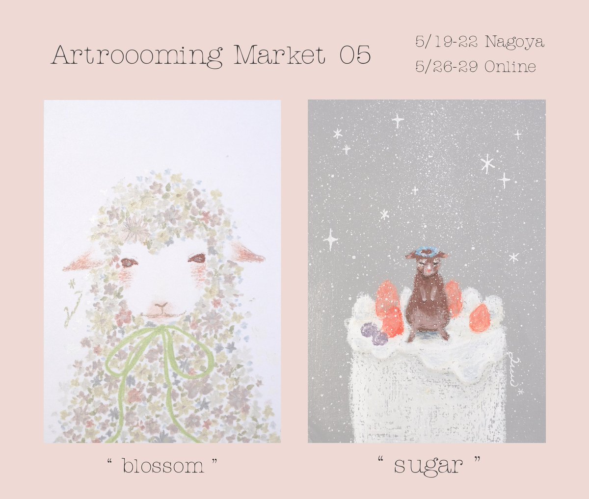 「Artrooming Market 05」 きょうからはじまります…! 5/19-22(名古屋・高山額縁店2F) 5/26-29(オンライン) 「blossom」と「sugar」 ふたりのひつじちゃんを 描きました🐑 よろしくお願いいたします❁ #artroomingMKT