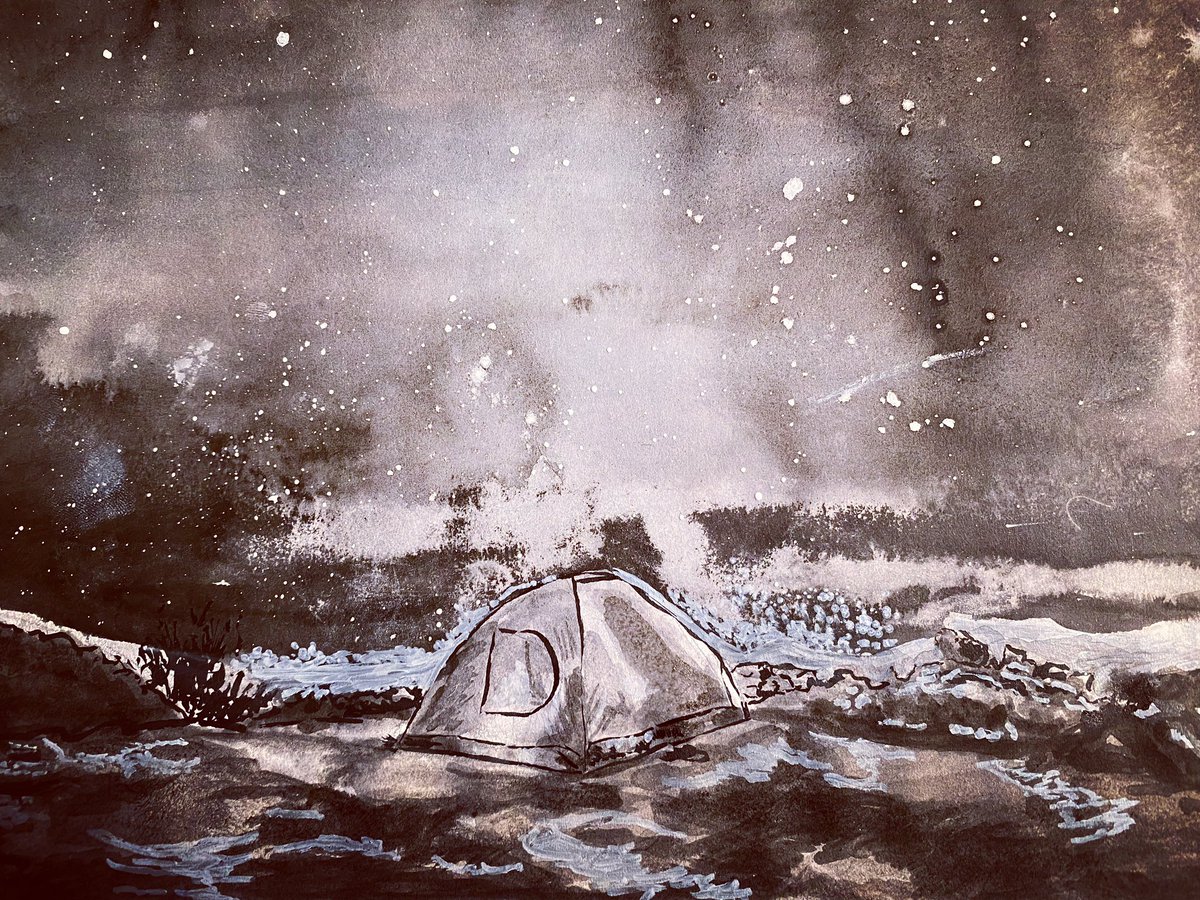 Inktober 2022 - Day 28: Camping ⛺️ @inktober #inktober #inktober2022 #ink #inktoberprompts #inkart #inkwash #inktoberday28 #inktobercamping #inktoberday28camping #artwork #ArtistOnTwitter #landscape #nightskyart #cosmicart