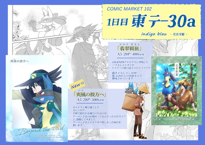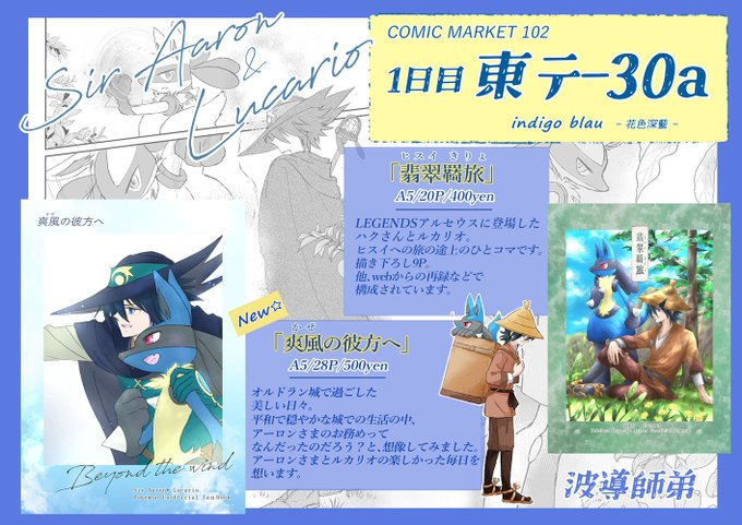 夏コミお品書きです🍫 新刊「爽風(かぜ)の彼方へ」 A5/28p/全年齢(BL寄り) オルドラン城のアーロンさまとルカリオのお話しです。 サンプルは支部に置いてますpixiv.net/artworks/11065… 【参加予定】夏コミ 8/12(土)1日目 東テ 30a スパコミ(関西) 8/20(日) 6号館C-ク 05b よろしくお願いします!