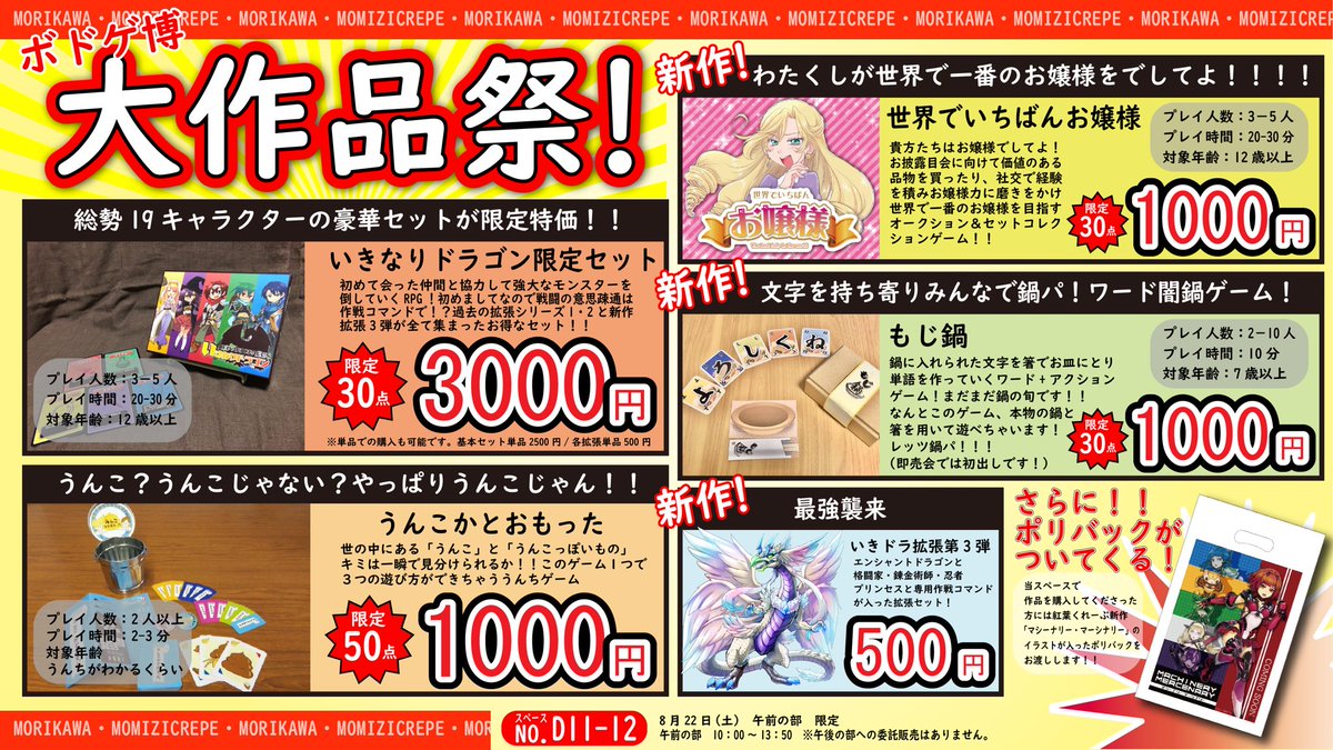 18 29 #ボドゲ博2あわせの作品をあげる見た人もやる #ボドゲ博 の紅葉くれーぷの お品書きができました! なんか新作3つありました(1つは春ゲムマ 予定のやつでしたが) 20/08/03 00:19