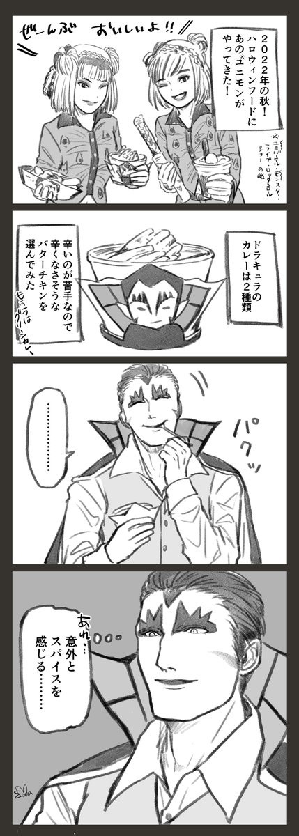 2022年USJハロウィンフードには色々な思い出があったので、一つ一つ紹介したいと思います✨ (ほぼ失敗談です) せっかくなのでそれぞれのキャラで描いてみた。 ※キャストさんとは一切関係ありません 【2022年ハロウィンフードの思い出①】 ドラキュラ・バターチキンカレー 味が意外だった話。