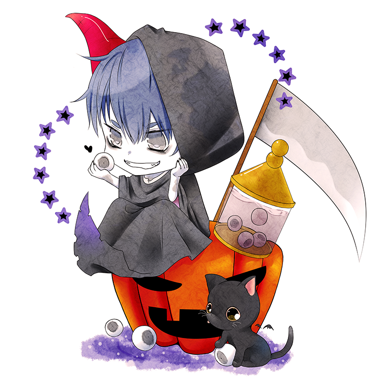 死神くん描きました! こちらはステッカーにして週末のデザフェス57から持っていきます 目玉持たせると可愛く描けるような気がします😳 黒猫の顔の下、塗り残しではないんですよー 舌ペロしてて、今回一番こだわったところなんです😆 #ステッカー #オリジナルキャラクター #オリジナルイラスト