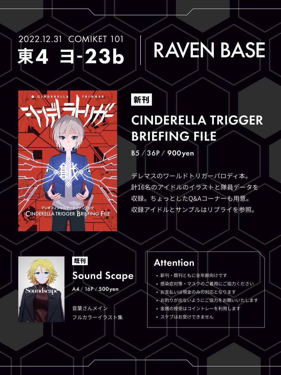 2 2 遅ればせながら告知です。 コミケ2日目東4ヨ-23bのRAVEN BASEにサークル参加させて頂きました。 主催のRabeくん(@AT_Krahe)によるデレマス×ワートリ本です。 2部隊の他に日菜子を描きました。 もうちょと下のアングルは是非本誌をお求め下さい! 私も主催と現地に居ります。よろしくお願い致します😆 22/12/30 23:19