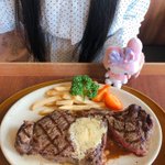 ここの『いちごのパフェ🍓』を 食べに来た⸜(๑⃙⃘'ᗜ'๑⃙⃘)⸝ その前に、 ステーキを食べたよ✨ψ(´ڡ`♡) #ステーキ #ぬい撮り 🐰