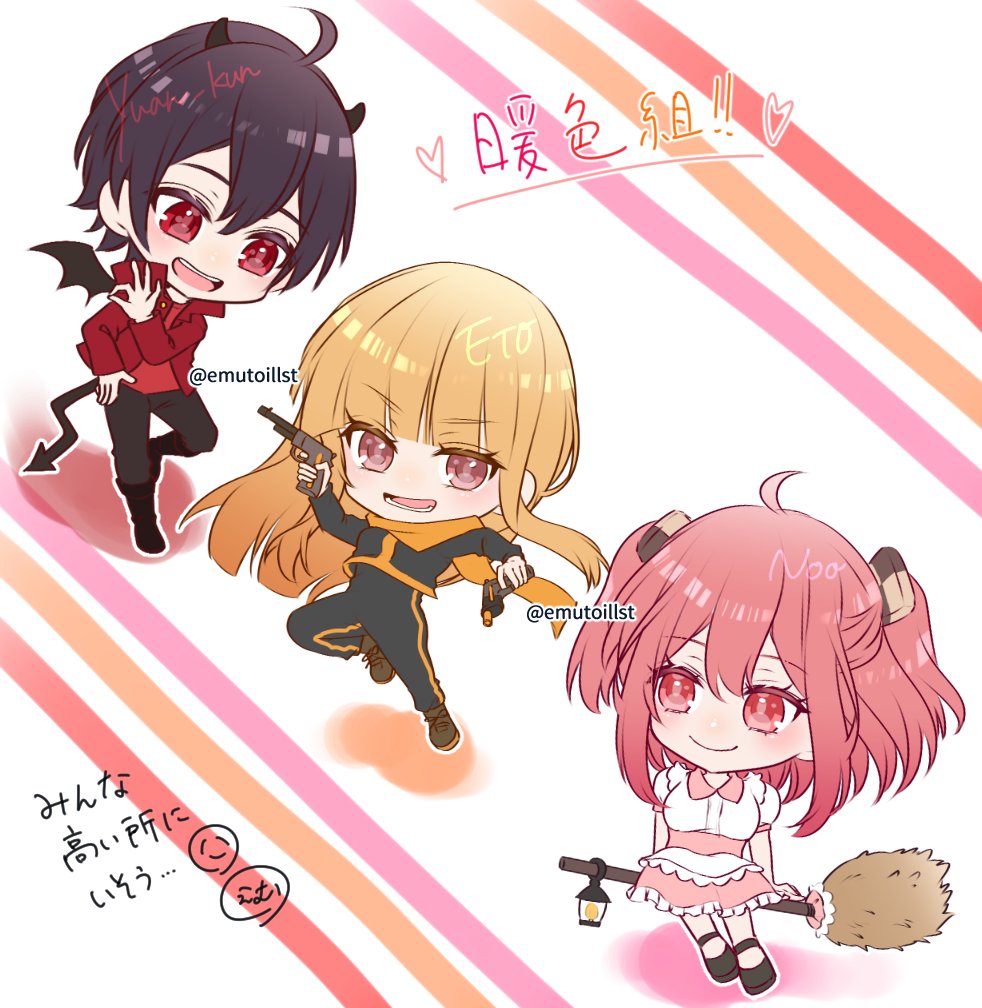 以前描いてたからぴちガールズ🍑を清書しました~ 簡易塗りですが……! \えとさん🧡るなさん💙のあさん💗/ #からぴち twitter.com/emutoillust/…