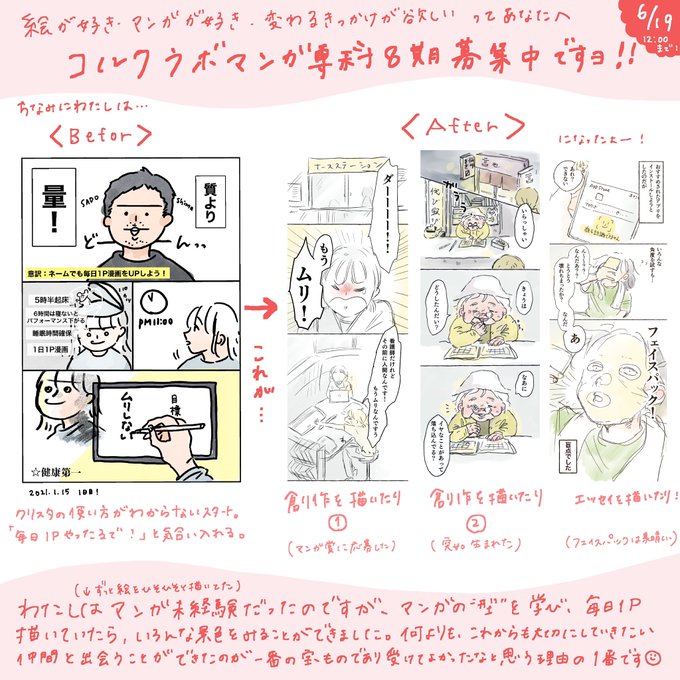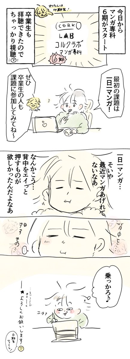 濃密な半年間になると思います! えいっと飛び込むだけの勇気さえ持っていけば、なんかなるようになるので笑、どうぞいってらっしゃい!! #締め切りは明日の正午 #コルクラボマンガ専科 twitter.com/corklab_school…