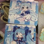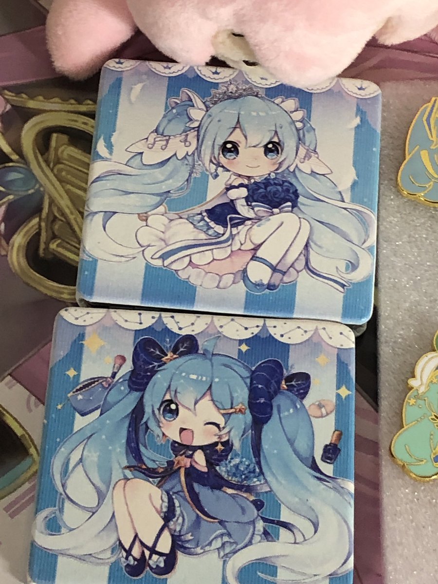にしなさん(@Nishina_hima)のコンパクトミラー&ピンバッチセットが届きました😊 歴代雪ミクさん勢揃いでとても可愛いです❤️