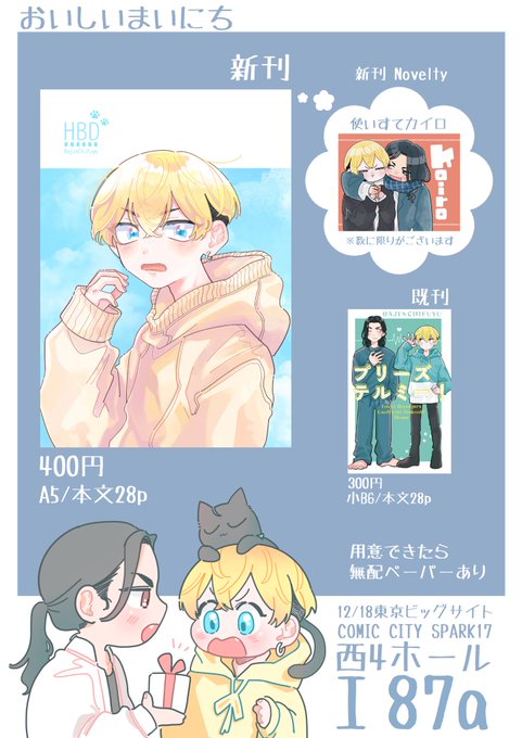 ❄️12/18 TOKYO罹破維武11 お品書き❄️ 新刊 ちふゆの誕生日をお祝いする3つの世界のお話 ①コンビニ店員パロ②アパート隣人パロ③ちハロ有軸生存if サンプル(ばじふゆ) pixiv.net/artworks/10325… トリオキニ(相互さん向け) triokini.com/circle/item/13… 🐯(イベント後追納予定) ecs.toranoana.jp/joshi/ec/item/…