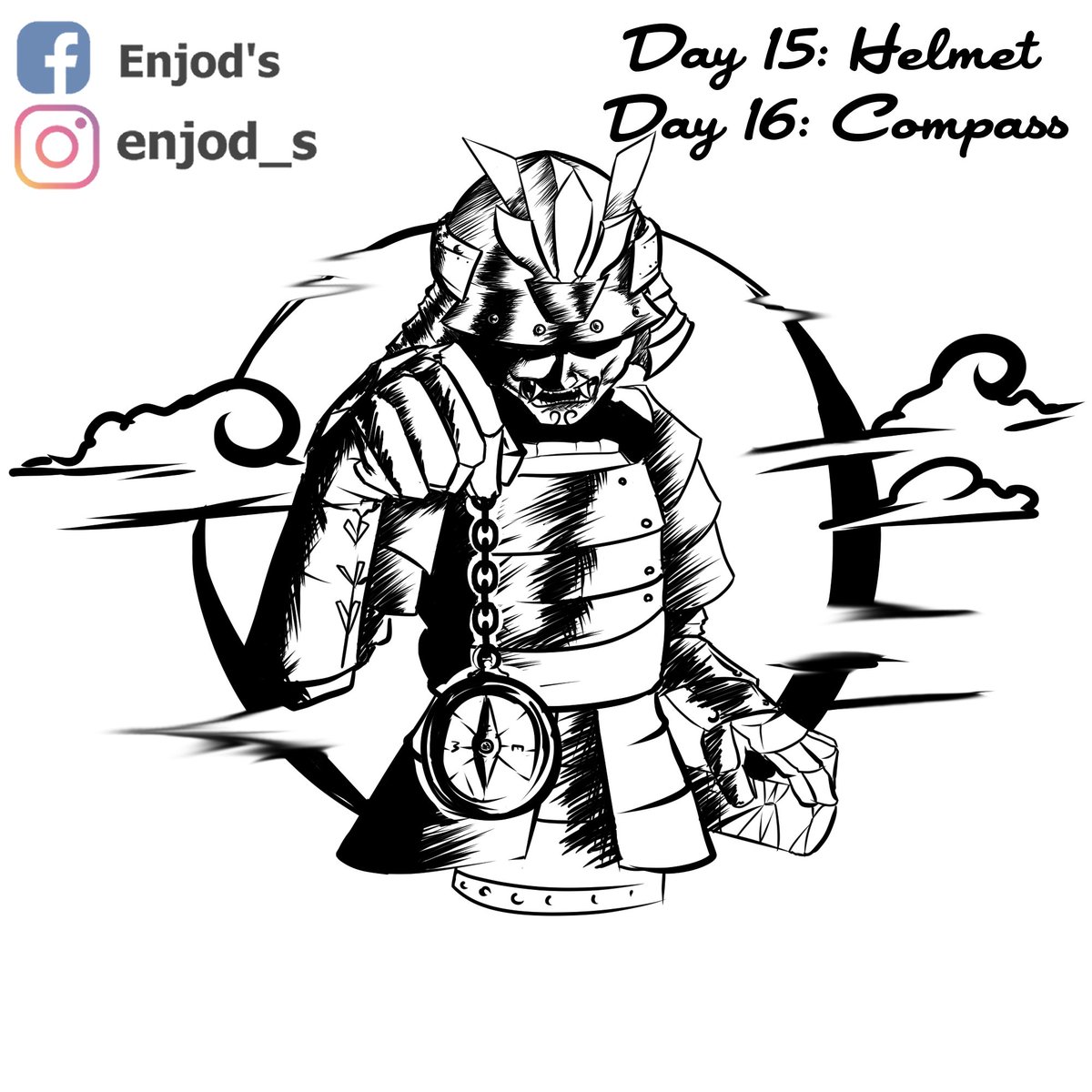 Retomando el Inktober con el día 15 y 16: Helmet/Compass #helmet #compass #inktober2021 #inktoberday15 #inktobersay16 #inktober #samurai #japan #clouds #inked #ink #digitaldrawing