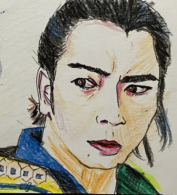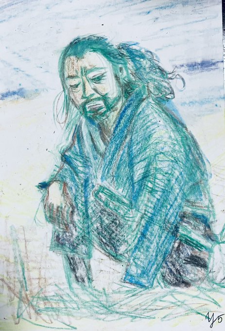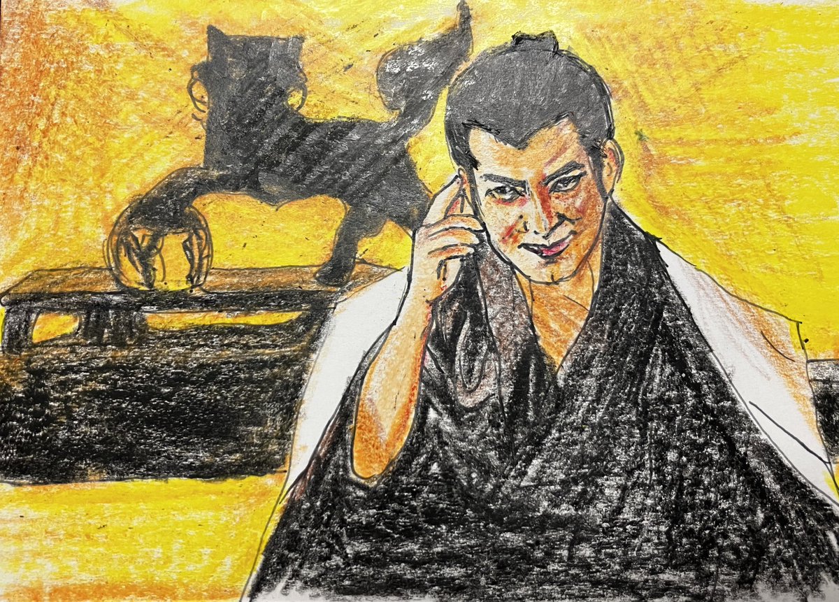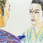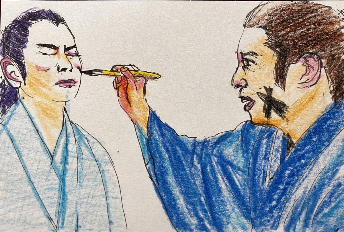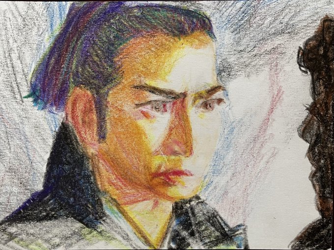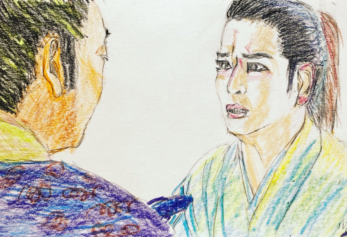 初登場シーンから伏し目。カッコイイ半蔵(ほんまにカッコイイです。力及ばずすまぬ。)この現場濃いw筆圧も濃くなる。 正信に連れてこられた半蔵はけっして目をあわせようとはしない。反して元康は目を見て半蔵を見定めようとするもできず。正信の同行を指示。 #どうする絵 #どうする家康