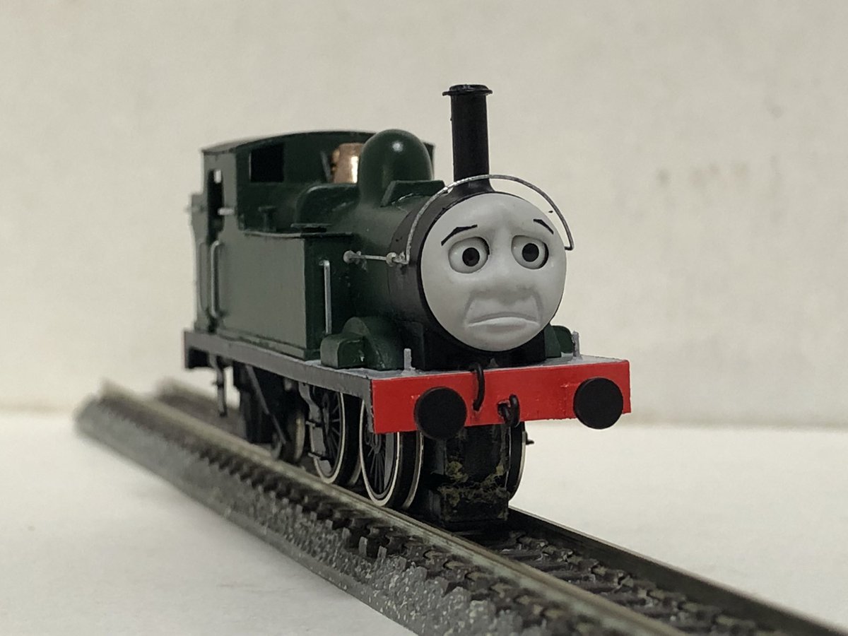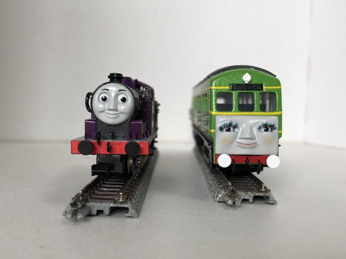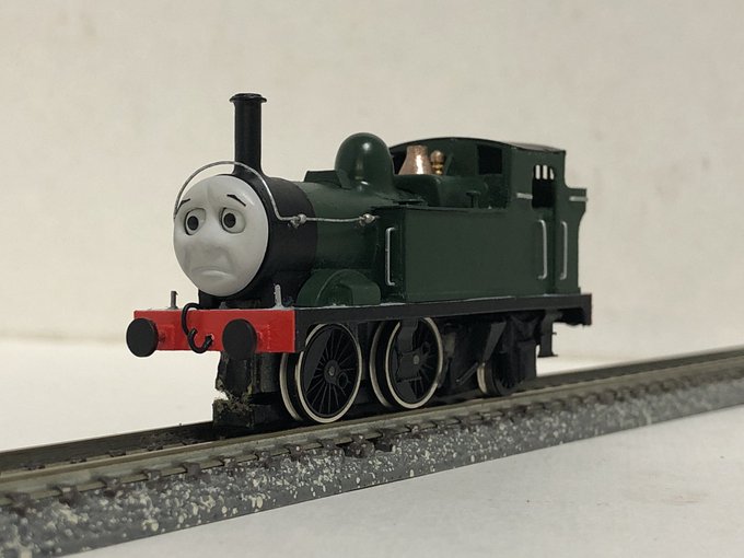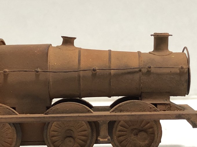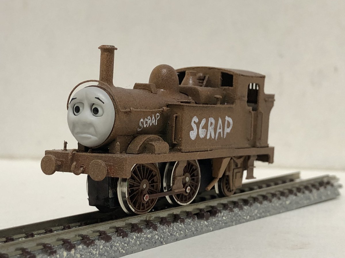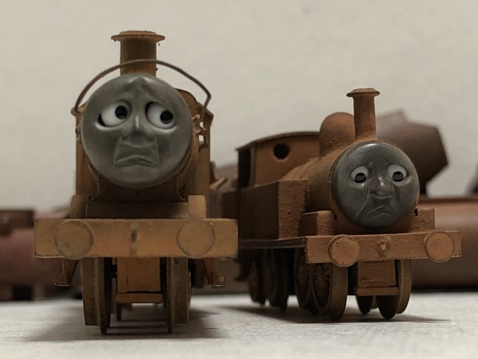 原作18巻のスクラップ機関車 LNWR 18xx 0-6-2とGWR 2251 class 0-6-0を作りました ボディは今回も厚紙とケント紙からフルスク、車輪はパテ複製、顔はそれぞれポケファントーマスと自作オリバー顔からの改造になります 表面の加工は消毒用エタノール吹き付け→乾かないうちにパステル粉吹きかけで