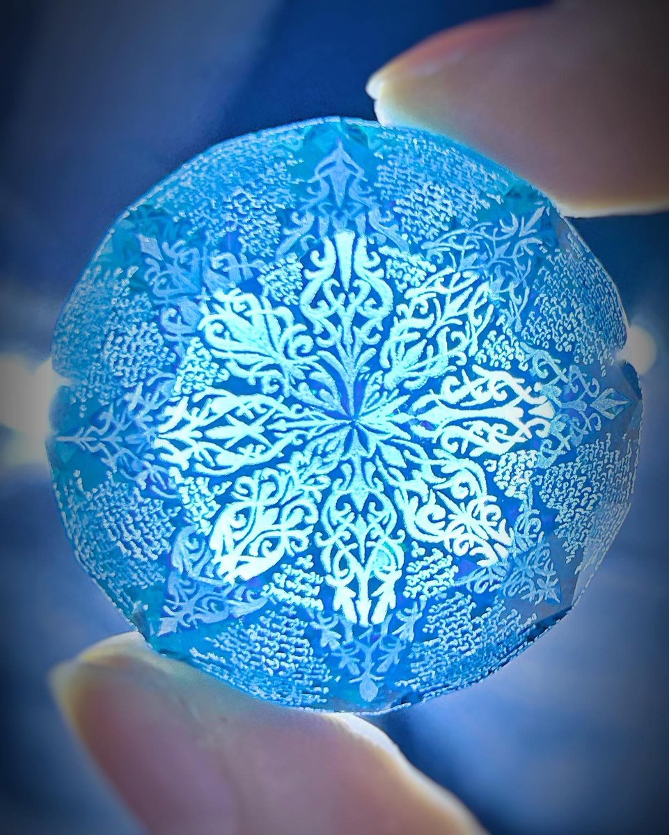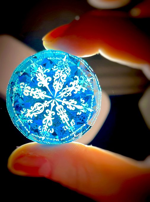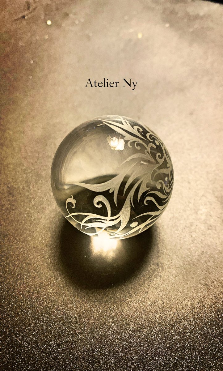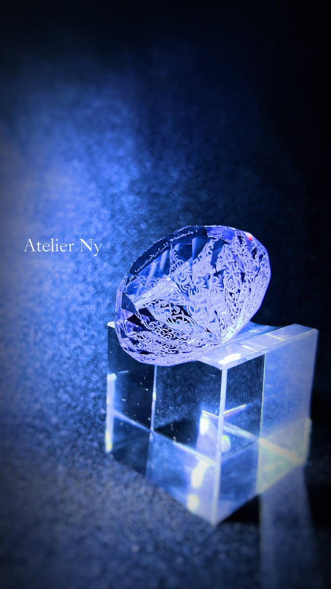 深いブルーの子。 電動ルーターを使用してフリーハンドの手彫りで制作しています。 大きさですが直径40mmぐらいです。 #ハンドメイド #ハンドメイド好きさんと繋がりたい #ガラスエングレービング