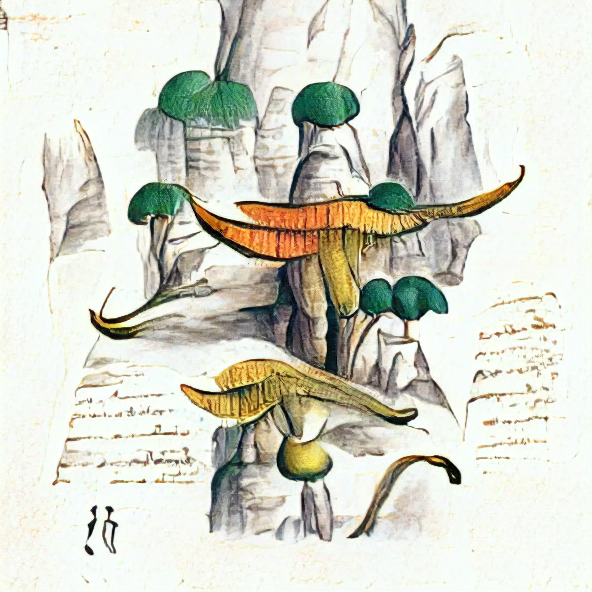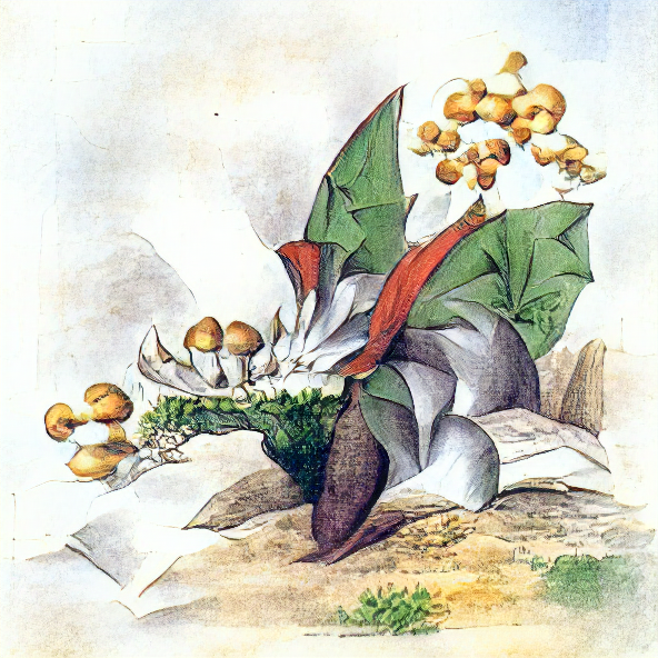 Challenge #Dracofungus de @Coliandre : 🐉🍄#11 : Gymnopile junonius Image générée par IA (#VQGANCLIP, modèle WikiArt-16384, 200 itérations, “in the style of Georg Dionysius Ehret”) #Smaugust2021 #Smaugust #MushroomSmaugust