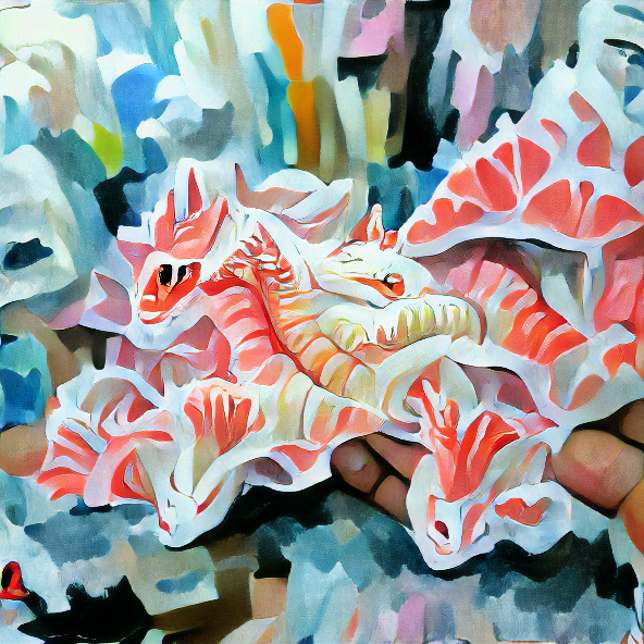 Challenge #Dracofungus : 🐉🍄#18 : Schizophyllum commune (« Le champignon ressemble à des vagues ondulantes de coraux serrés ou à un éventail chinois détaché ») Image générée par IA (#VQGANCLIP, modèle WikiArt 16384, 200 itérations) #Smaugust2021 #Smaugust #MushroomSmaugust