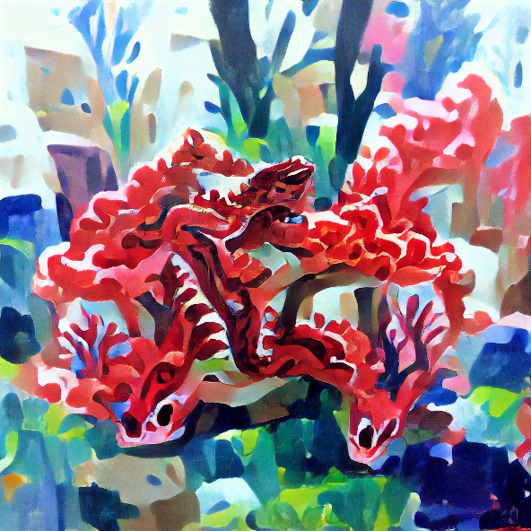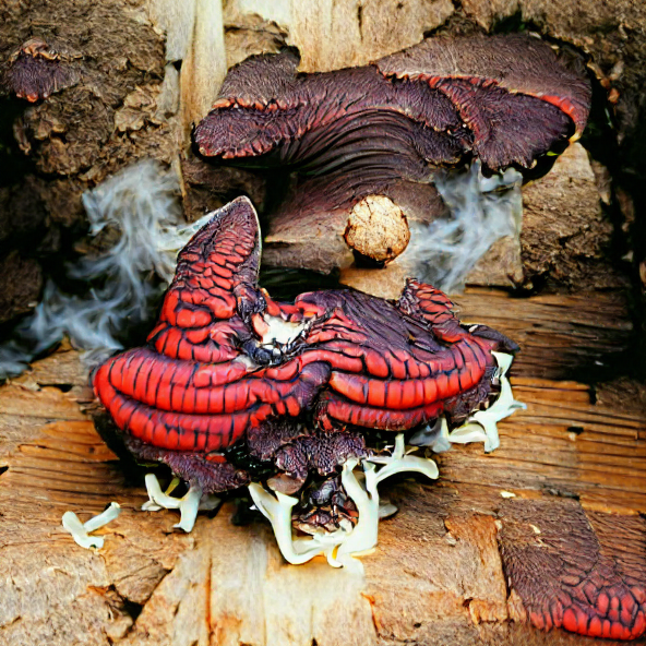 Challenge #Dracofungus : 🐉🍄#18 : Schizophyllum commune J’ai aussi fait cette version rouge que j’aime bien, mais qui ressemble moins au champignon d’origine 😃 Image générée par IA (#VQGANCLIP, modèle WikiArt 16384, 200 itérations) #Smaugust2021 #Smaugust #MushroomSmaugust
