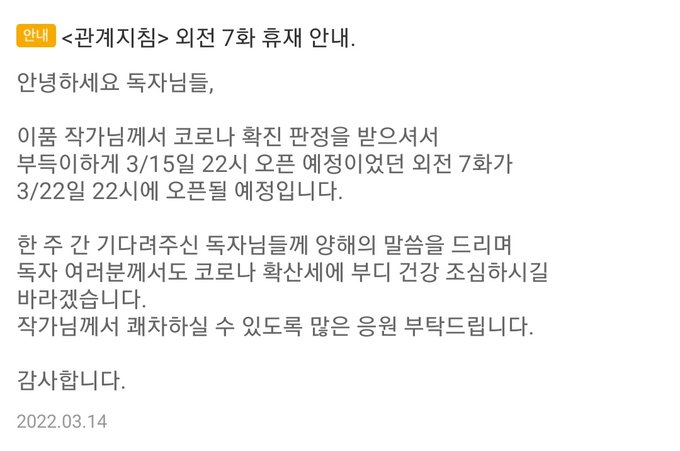 <관계지침>이 카카오웹툰에도 런칭됐습니다.🎉 19세 이용가로 성인인증을 해야하며, 외전을 편집 없이 올리기 위함일 뿐. 사실상 본편은 15금, 외전은 17금 정도 될 것 같네요! 주 2회 무료 오픈 후 유료화 예정입니다. 감사합니다! webtoon.kakao.com/content/%EA%B4…