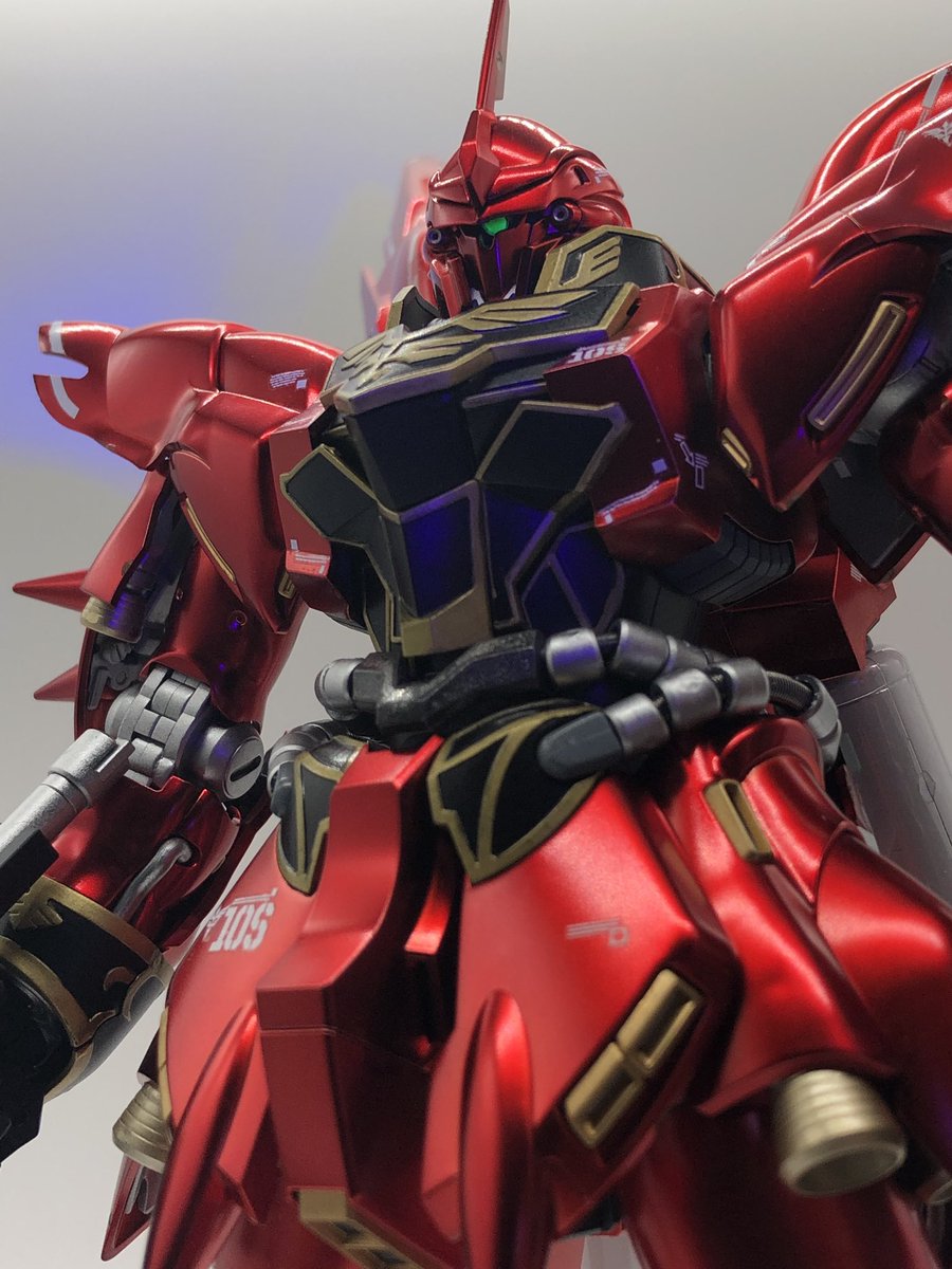そういやずっと前に完成したけどほっといたMGシナンジュチタニウムフィニッシュ出来た。 フレームとか金ラインは下地黒で塗装もしてます ブラックライトでモノアイも光るよ