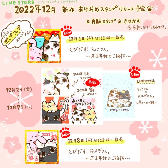 【お知らせ】 🎄2022年12月 #LINEスタンプ リリース予定⛩️ ①12月1日AM11:00~ (新作)「とびだす!ちょこさん。」 ②12月2日~12月7日 (再販)あけおめスタンプ 2021年BIGスタンプ 2022年動くスタンプ×2 (新作)LINEきせかえ ③12月8日AM11:00~ (新作)「とびだす!おはぎさん。」 🙇