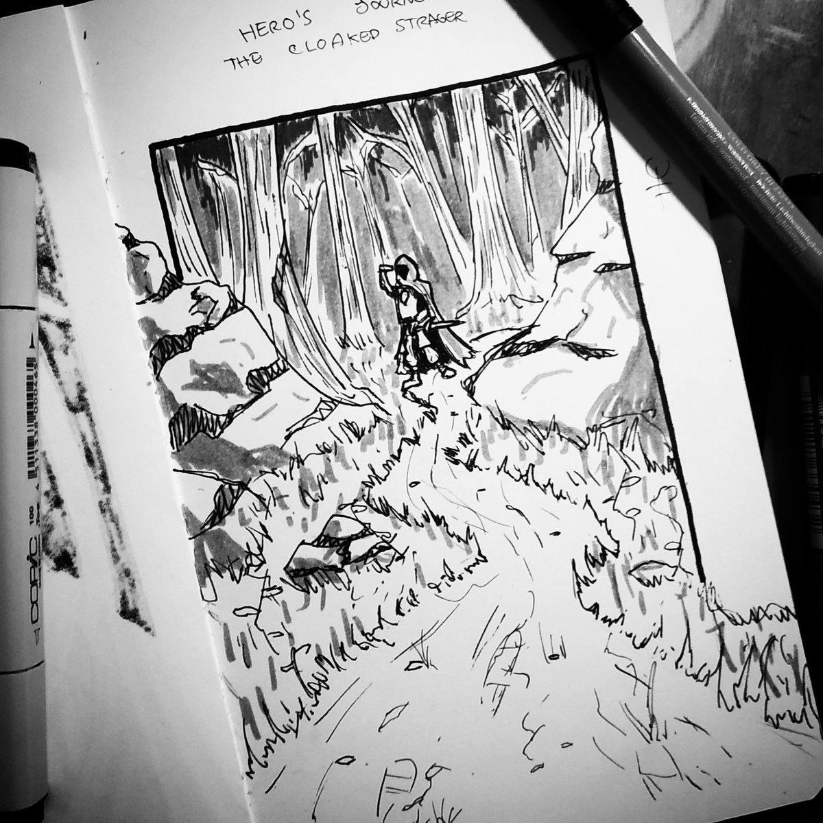 #inktober2019 14 - Hero's Journey: The Cloaked Stranger. Where one path ends, another begins. instagram.com/p/B3ngRMhoKJU/ #Inktober #Fantasy #DungeonsAndDragons #Homebrew #Art #Sketch #Ink #Forest #Ranger