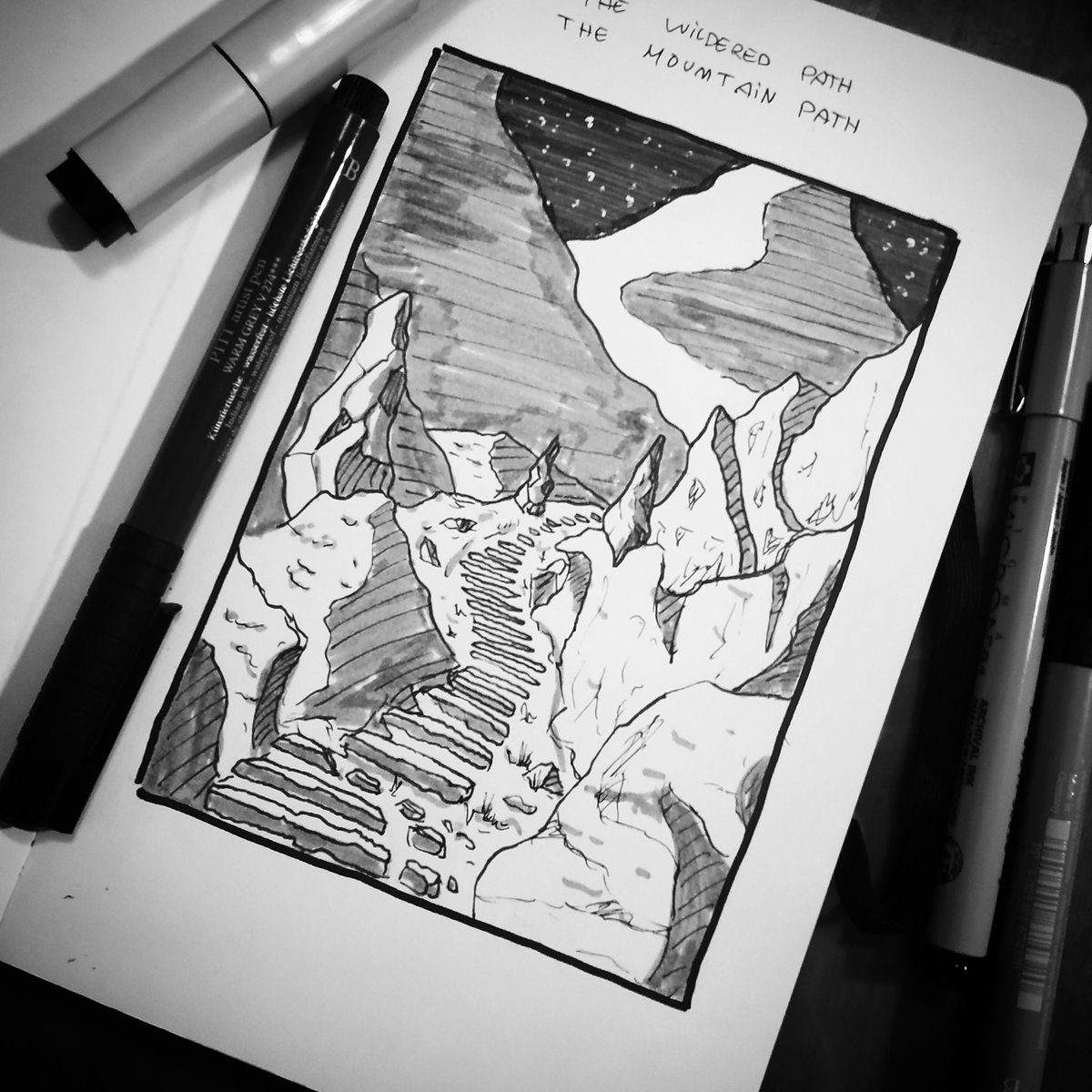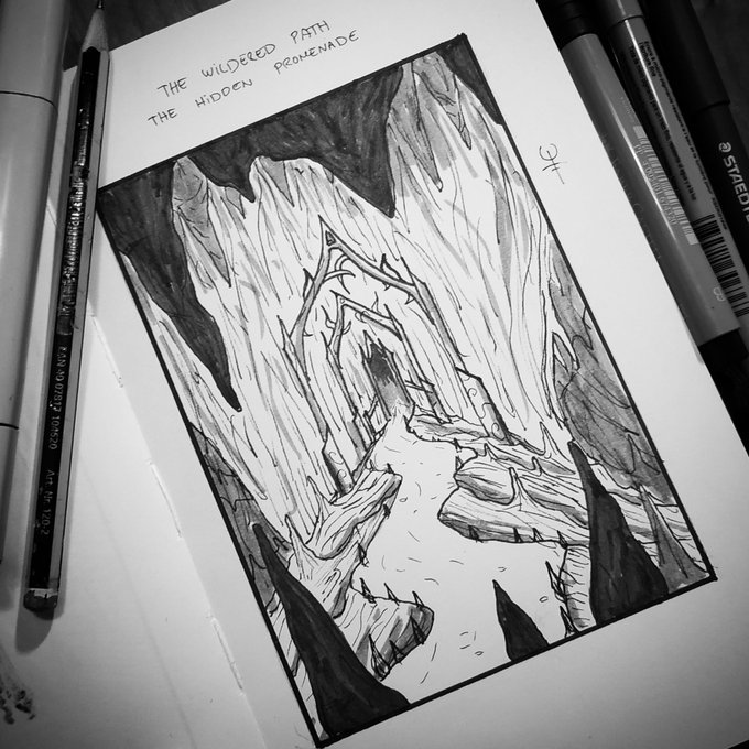 #inktober2019 25 - The Wildered Path: The Hidden Promenade. Deep beneath Haradin's Wall lie the labyrinthine caves of the Dark Elves. #Inktober #Fantasy #DungeonsAndDragons #Homebrew #Art #Sketch #Ink #tarot #Cave #Gateway #Promenade