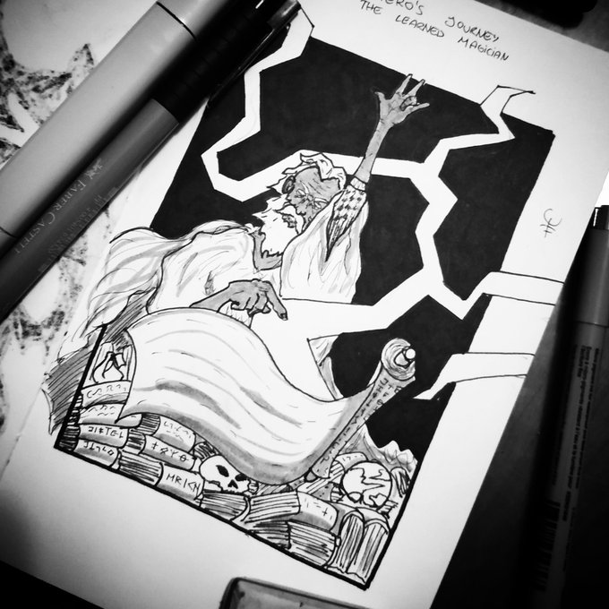 #inktober2019 16 - Hero's Journey: The Learned Magician. When it comes to wizards it's hard to tell the difference between wisdom and madness. instagram.com/p/B3sel3vIPWT/ #Inktober #Fantasy #DungeonsAndDragons #Homebrew #Art #Sketch #Ink #Mage #Wizard