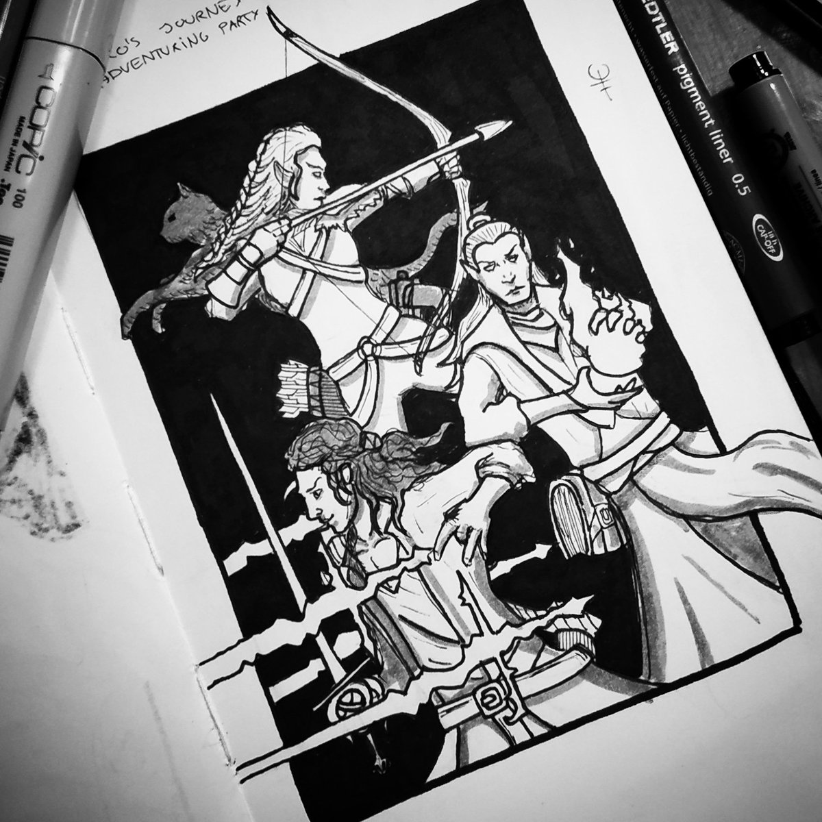 #inktober2019 17 - Hero's Journey: The Adventuring Party. The path is long and arduous unless you have friends at your side. instagram.com/p/B3vSq1ZILgL/ #Inktober #Fantasy #DungeonsAndDragons #Homebrew #Art #Sketch #Ink #Bard #Hunter #Wizard #Group #Adventure