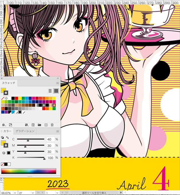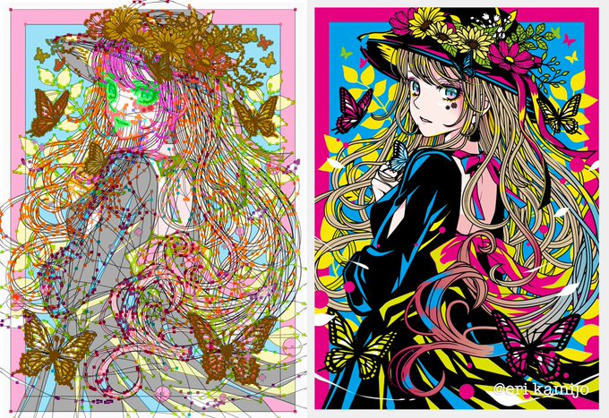 知らない方もいるのであらためて説明を。 普段はIllustratorでイラストを描いてます。 パス画像と完成絵を重ねてみました。 時間はかかりますが楽しい作業でもあります。 #Illustrator #ベジェ