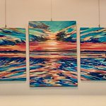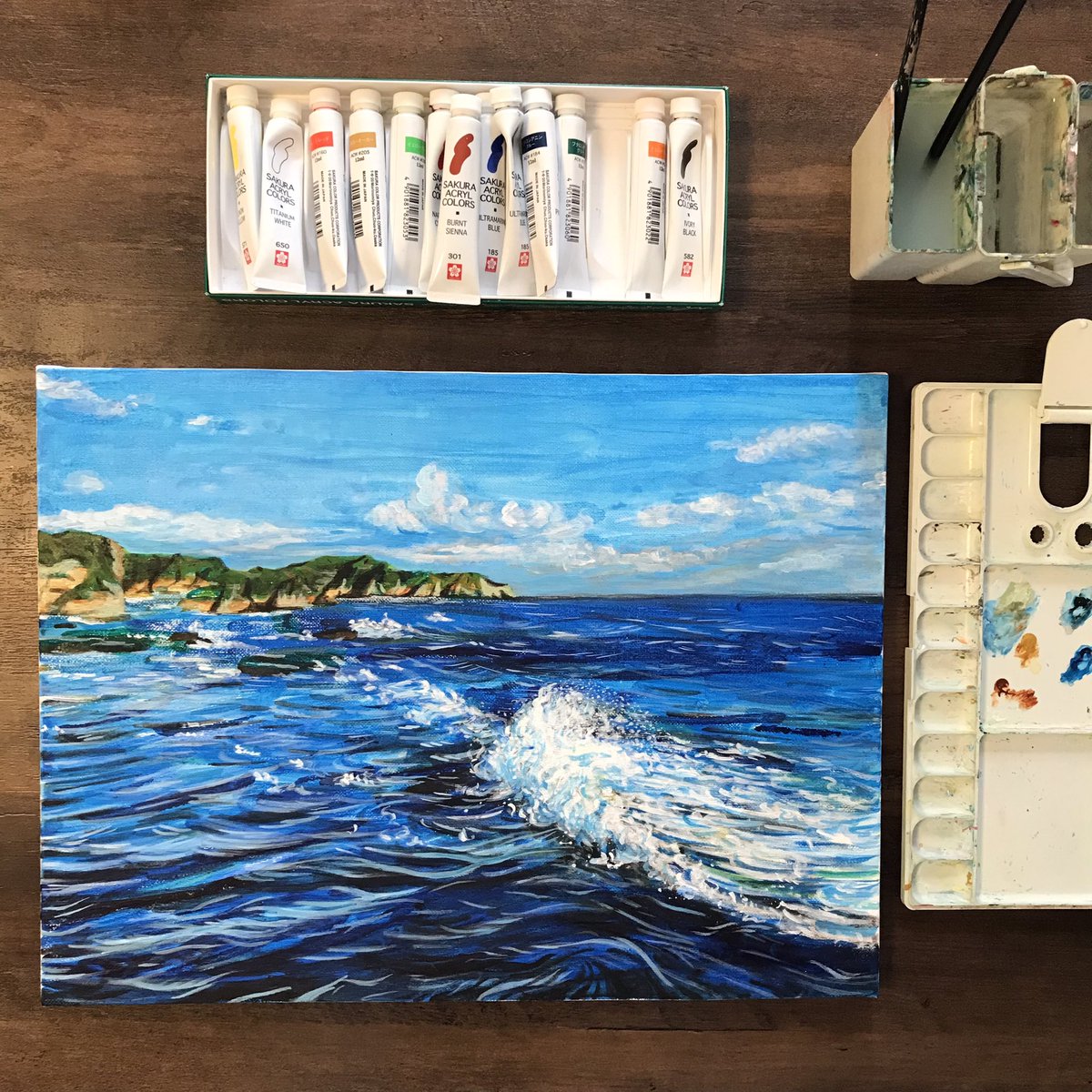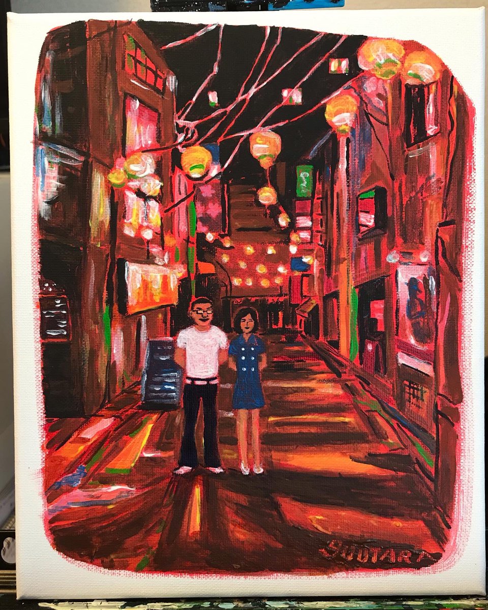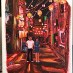 「magic hour」 父がめずらしくジーパンをはいていた。褒めたら母のほうがうれしそうだった。「わたしが選んだのよ〜」だって☺️ 手元にある二人の写真を元に、少しだけ魔法をかけて二人が恋人だった頃を描いてみました。 #acrylicpainting #magic #アクリル画 #絵描きさんと繋がりたい #父 #母 #恋人