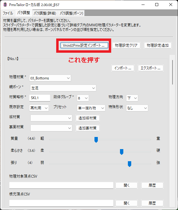 56 159 VRoid Studio + Vroid2Pmx + PmxTailor で、MMDで動くモデルがサクッとできた。 PmxTailorで「Vroid2Pmx設定インポート」すれば物理パラメータ設定も自動。 22/07/09 15:54