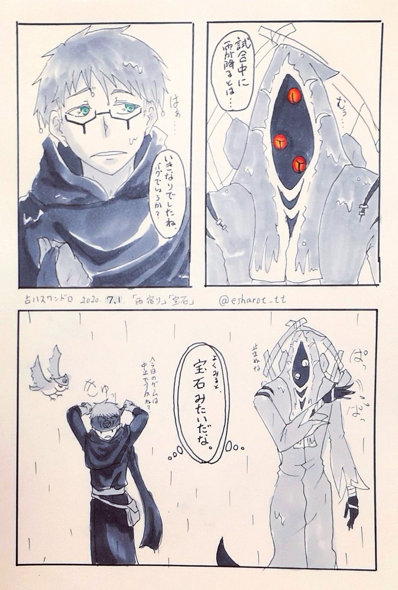 お邪魔します…… お題の「宝石」「雨宿り」お借りしました! 先週確認不足で描いちゃったので日付だけ直してます。 綺麗なおめめの話。これはまだ付き合ってない占ハス。 #占ハス版深夜の60分一本勝負