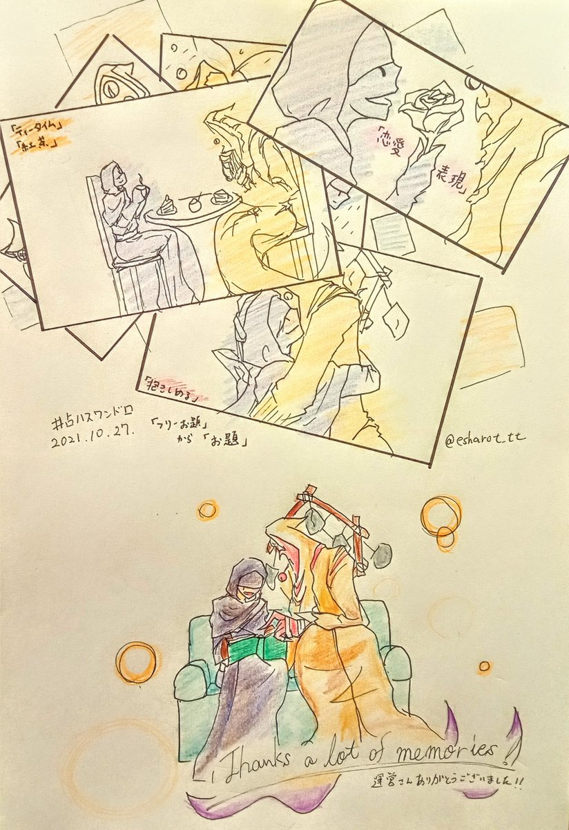 タグお邪魔します。 「フリーお題」から「お題」で描かせていただきました。お題というか思い出になってますが…… 素敵な占ハスをいろんなお題で楽しめて、毎週の潤いでした。 運営さん本当にお疲れ様でした&ありがとうございました! #占ハス版深夜の60分一本勝負