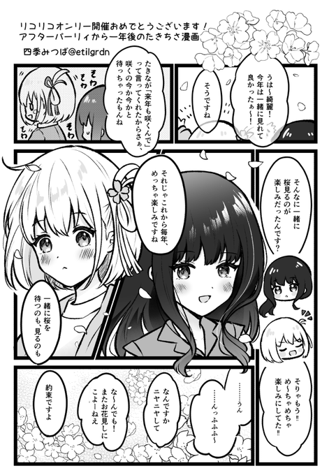 オンリーで頒布した無配たきちさ漫画です! アフターパーリィの会話からさらに一年後の話🌸
