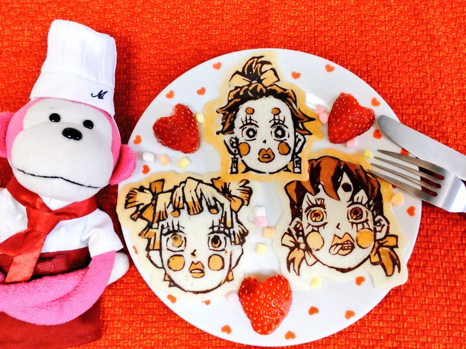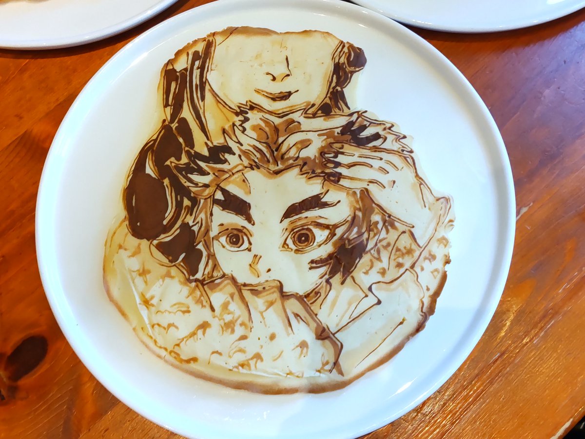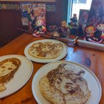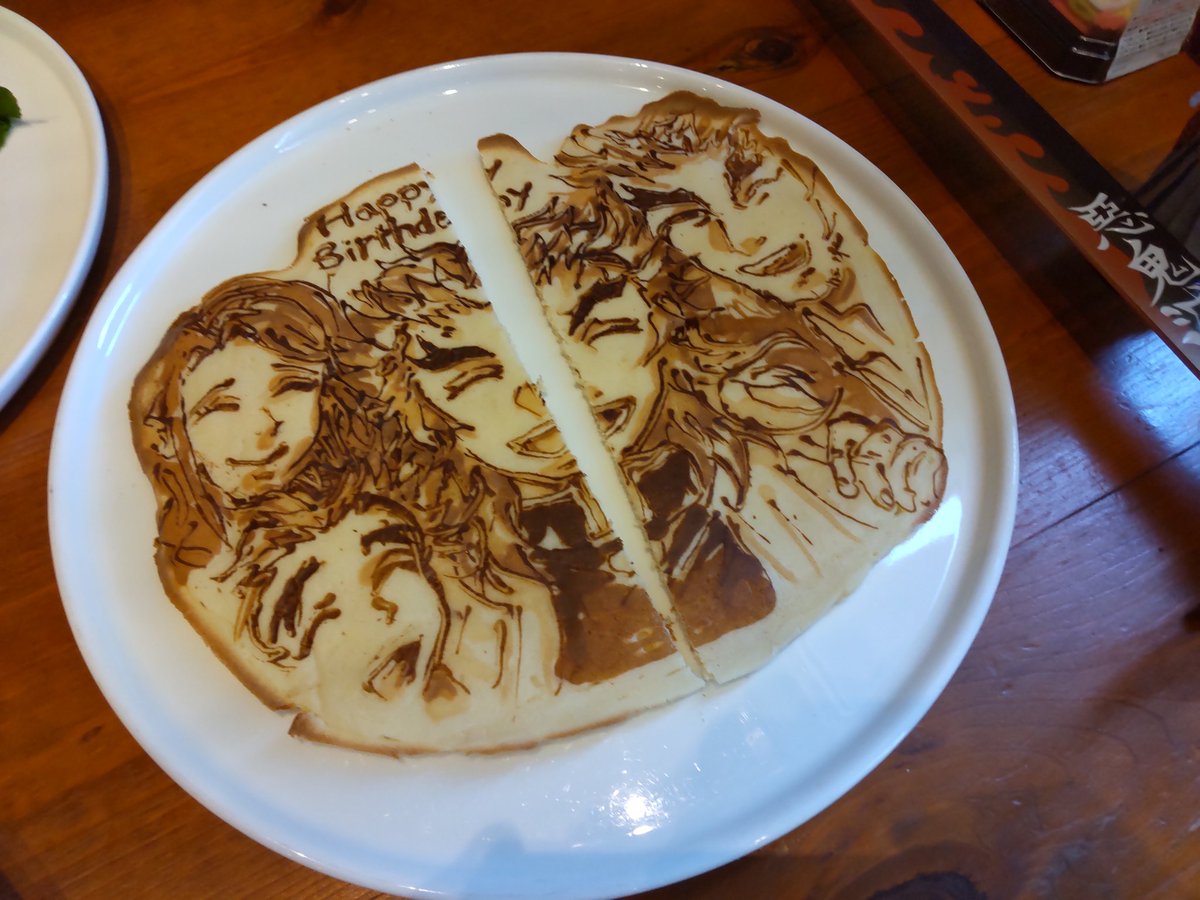 お師匠殿のお店(@LaRicetta99様)にて、すみれんさん(@sumirren_violin)と #煉獄杏寿郎生誕祭2022 #煉獄杏寿郎誕生祭2022 開催してきました! シェフが煉獄さんの日輪刀貸してくれたよー🔥わっしょい! #パンケーキアート #pancakeart