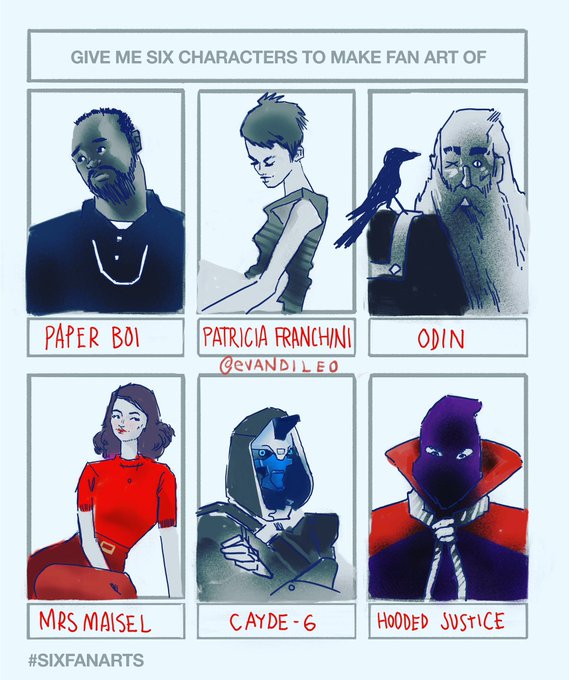 #sixfanarts from media I’ve been watching/reading #paperboi #atlanta #breathless #aboutdesouffle #jeanseberg #odin #allfather #norsemythology #mrsmaisel #destiny #cayde6 #watchmen #hoodedjustice