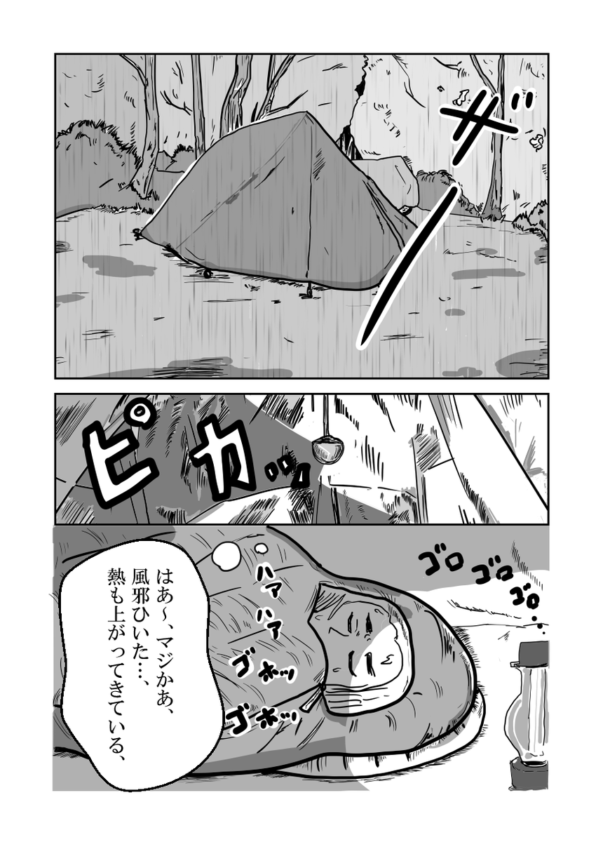 漫画『半分猫』44 夜雨そして朝日 rookie.shonenjump.com/series/pGBIkZk… manga.line.me/indies/product… #漫画 #漫画が読めるハッシュタグ #キャンプ #夜雨 #朝日 #風邪