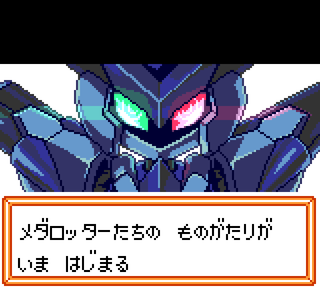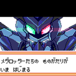 #メダロットS 初回起動時のプロローグ?でクロスメサイアが出てくるシーンを「メダロット2」風にドット絵化してみました。2.5周年おめでとうございますという事で^ ^ あくまで“風”ですw 色の数も「2」のイベントシーンで見たのよりはオーバーしちゃってますので; #メダロット #ドット絵